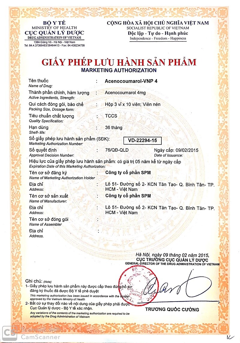 Acenocoumarol 4 Điều trị và ngăn ngừa bệnh nghẽn mạch ... được Cơ quan quản lý nhà nước cấp giấy xác nhận công bố lưu hành trên toàn quốc, Số:VD-22294-15