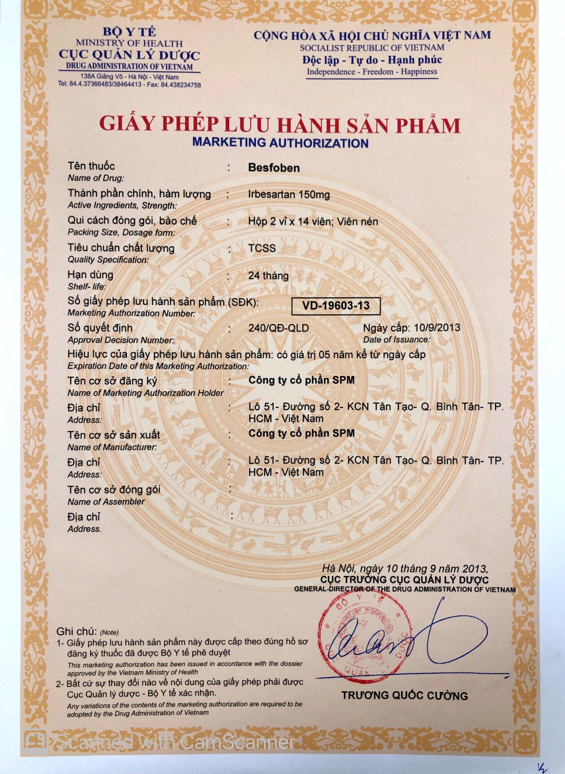 Besfoben Điều trị tăng huyết áp nguyên phát. Điều trị bệnh thận ở bệnh nhân đái tháo đường tuýp 2 có tăng huyết áp... được Cơ quan quản lý nhà nước cấp giấy xác nhận công bố lưu hành trên toàn quốc, Số:VD-19603-13