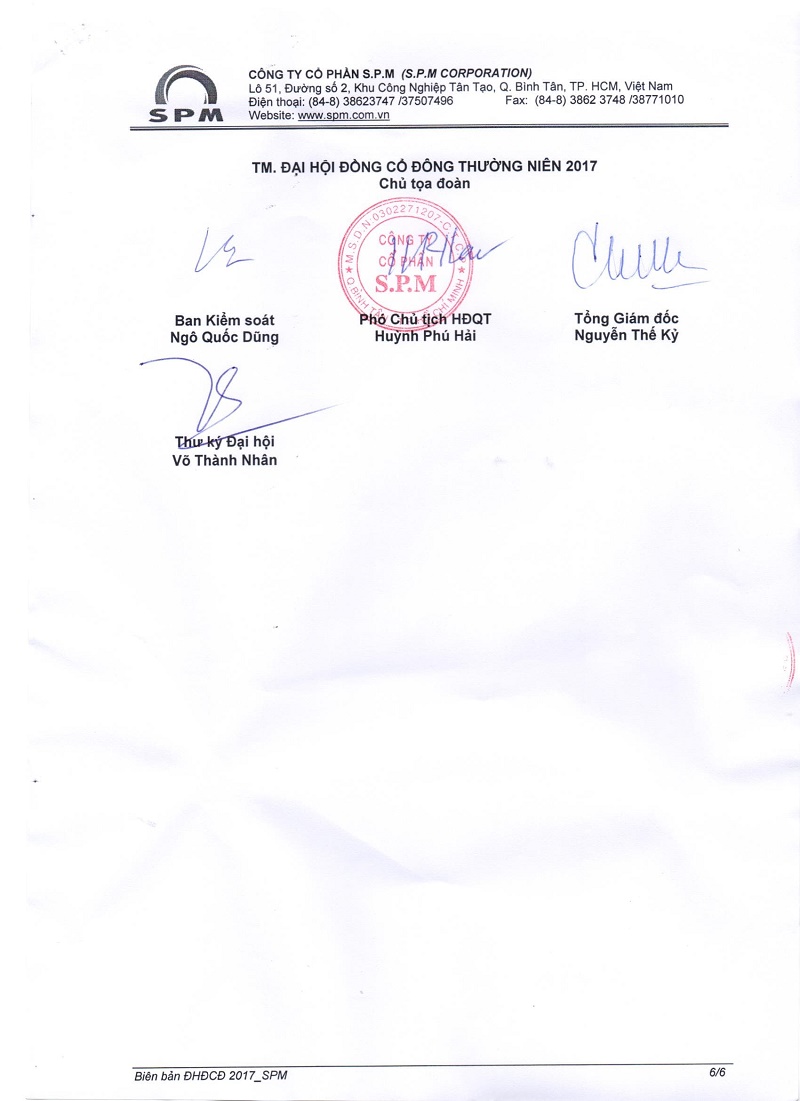 Thành phố Hồ Chí Minh, ngày 30/06/2017 – tại Hội trường Nhà máy ở địa chỉ Lô 51 đường số 2, KCN Tân Tạo, phường Tân Tạo A, quận Bình Tân, Công ty Cổ phần SPM đã tổ chức Đại hội Cổ đông thường niên.