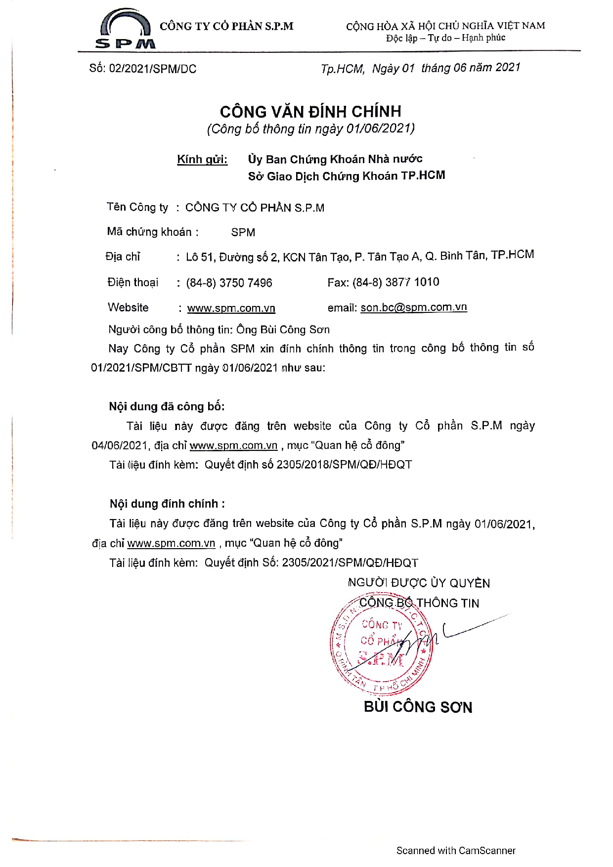 Công văn đính chính V/v Công bố thông tin ngày 01/06/2021 Đăng bởi Công ty Cổ phần SPM vào lúc 01/06/2021 Bài viết liên quan BÁO CÁO QUẢN TRỊ 30-06-2025 CÔNG BỐ THÔNG TIN SAU ĐẠI HỘI CỔ ĐÔNG 2025 Tài Liệu Đại Hội Cổ Đông 2025 ĐÍNH CHÍNH THÔNG BÁO CHIA CỔ TỨC 2024 CHIA CỔ TỨC