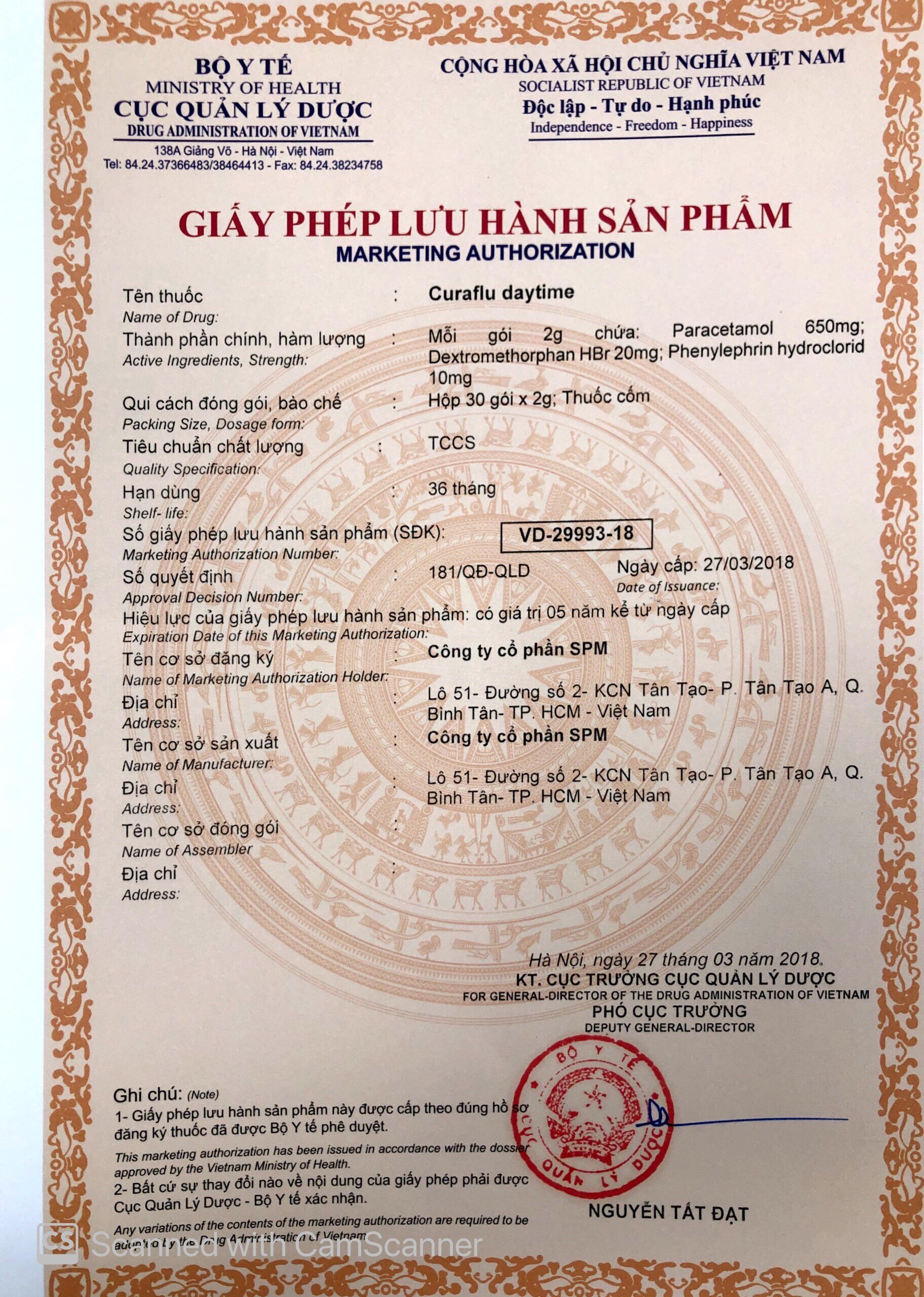 Curaflu Daytime Điều trị các triệu chứng sốt, ho, các cơn đau nhẹ, đau họng, nhức đầu, sung huyết mũi.Làm loãng đàm và làm loãng dịch tiết phế quản giúp dễ ho... được Cơ quan quản lý nhà nước cấp giấy xác nhận công bố lưu hành trên toàn quốc, Số: VD-29993-18