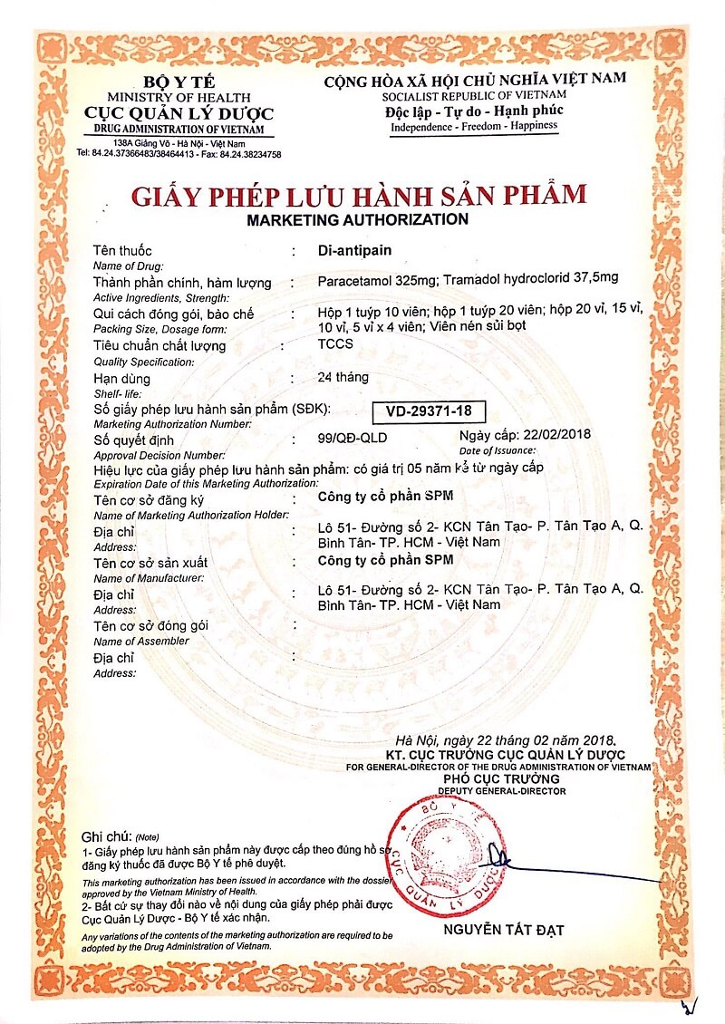 Di-Antipain (viên sủi) điều trị được chỉ định các cơn đau từ trung bình đến nặng ... được Cơ quan quản lý nhà nước cấp giấy xác nhận công bố lưu hành trên toàn quốc, Số: VD-29371-18