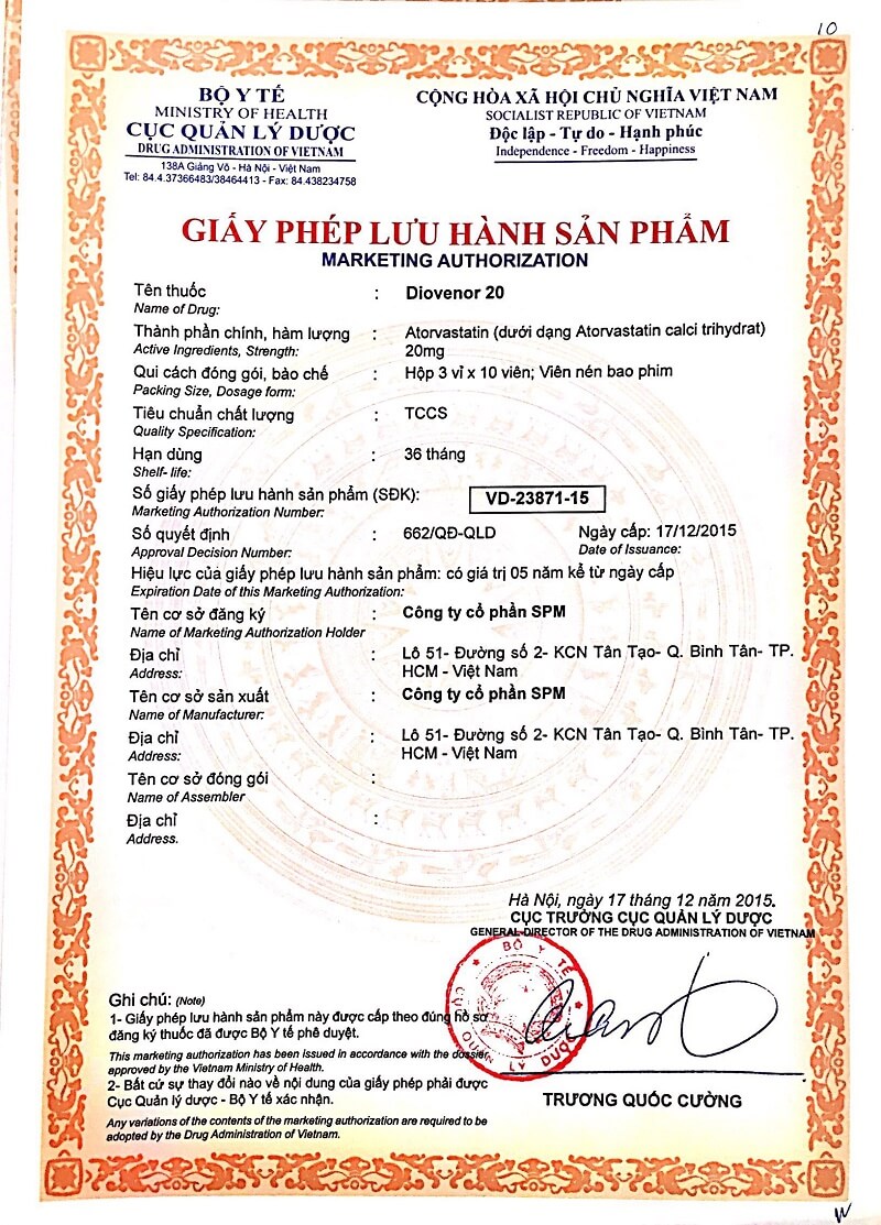 Divenor 20 Điều trị tăng Cholesterol máu, Ngăn ngừa các vấn đề tim mạch…được Cơ quan quản lý nhà nước cấp giấy xác nhận công bố lưu hành trên toàn quốc, Số: VD-23871-15