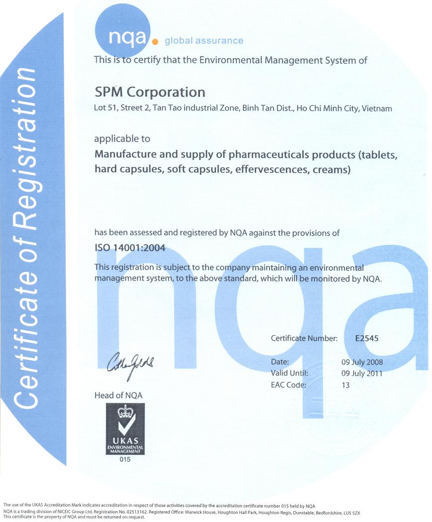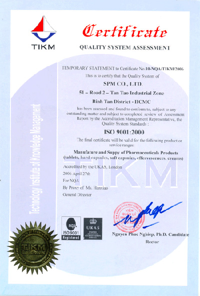 SPM tự hào là doanh nghiệp có nhà máy sản xuất đạt chứng nhận GMP (Good Manufacturing Practices – Thực hành sản xuất thuốc tốt), GLP (Good Labolatory Practices – Thực hành kiểm nghiệm thuốc tốt), GSP (Good Storage Practices – Thực hành bảo quản thuốc tốt) theo tiêu chuẩn ASEAN cho dây chuyền sản xuất thuốc viên, viên nang, thuốc nhỏ mắt và thuốc dùng ngoài da. Hệ thống quản lý chất lượng đạt tiêu chuẩn ISO 9001:2000 do Tổ chức Chứng nhận Chất lượng Quốc tế UKAS (Anh) chứng nhận. Đạt chứng nhận GMP theo tiêu chuẩn của tổ chức Y tế Thế giới (GMP- WHO).