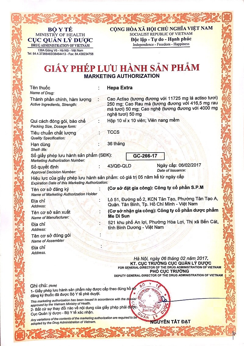 Hepa Extra hỗ trợ điều trị các bệnh về gan, mật được Cơ quan quản lý nhà nước cấp giấy xác nhận công bố lưu hành trên toàn quốc, Số: GC-266-17