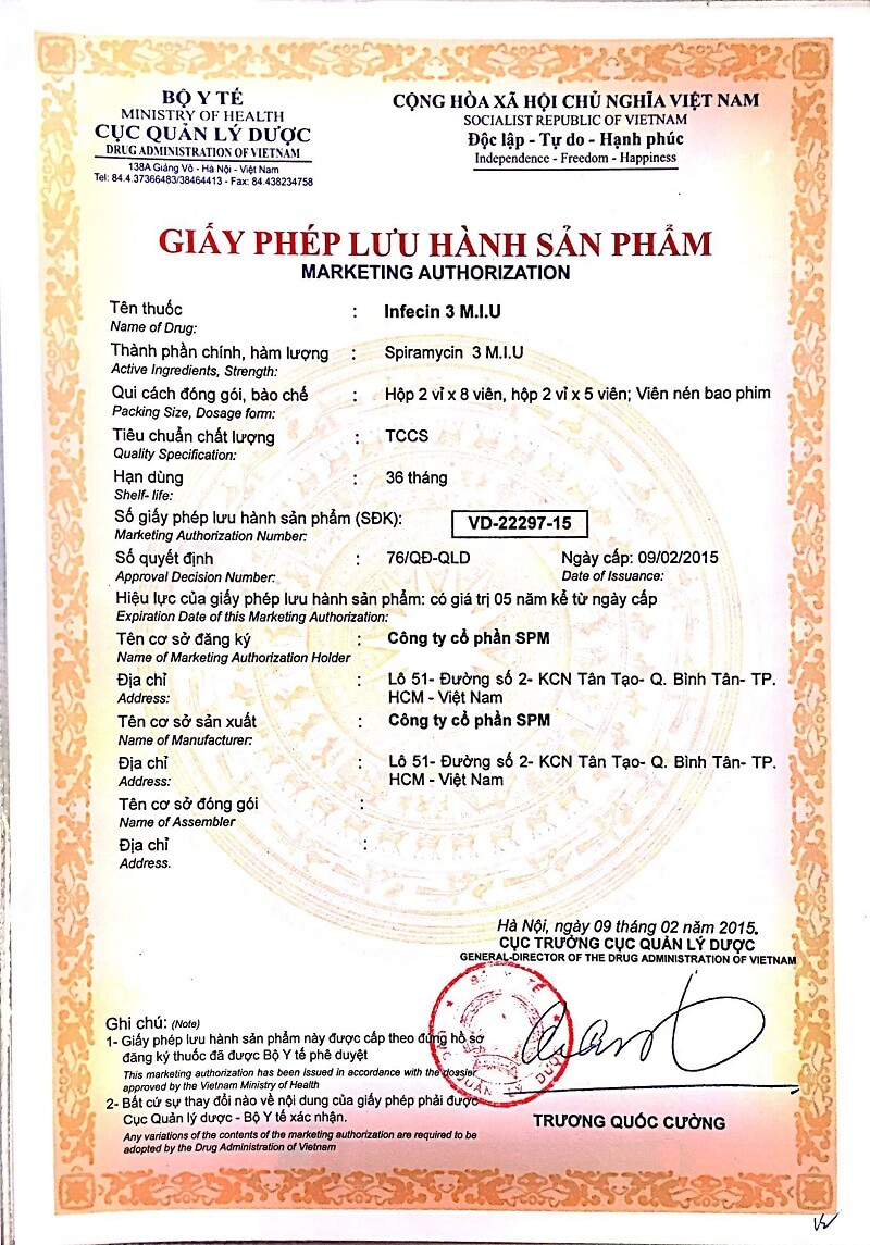 Infecin 3 M.I.U Trị nhiễm trùng đường hô hấp trên và dưới, viêm tai mũi họng, viêm xoang cấp, phế quản, phổi. Các bệnh nhiễm trùng răng, miệng, da, xương và nhiễm trùng đường sinh dục. Phòng bệnh viêm màng não tái phát… được Cơ quan quản lý nhà nước cấp giấy xác nhận công bố lưu hành trên toàn quốc, Số: VD-22279-15