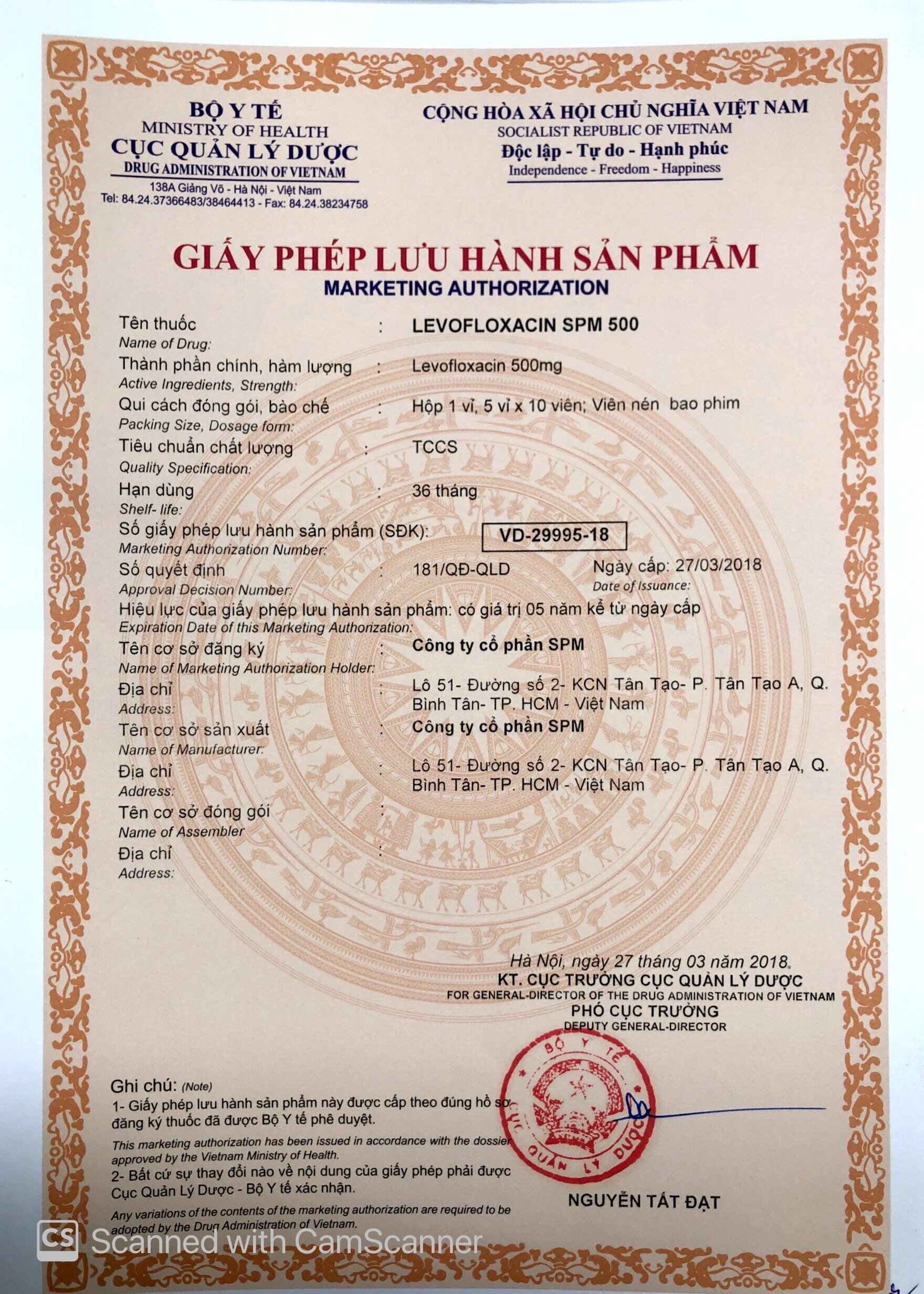 Thuốc điều trị các chứng Viêm phổi cộng đồng, Nhiễm trùng da và tổ chức dưới da không biến chứng, Nhiễm khuẩn đường mật, Viêm tiền liệt tuyến mạn tính, Dự phòng sau phơi nhiễm và điều trị bệnh than, Đợt cấp của viêm phế quản mạn tính, Viêm xoang cấp tính do vi khuẩn Levofloxacin SPM 500 được Cơ quan quản lý nhà nước cấp giấy xác nhận công bố lưu hành trên toàn quốc, Số: VD-29995-18