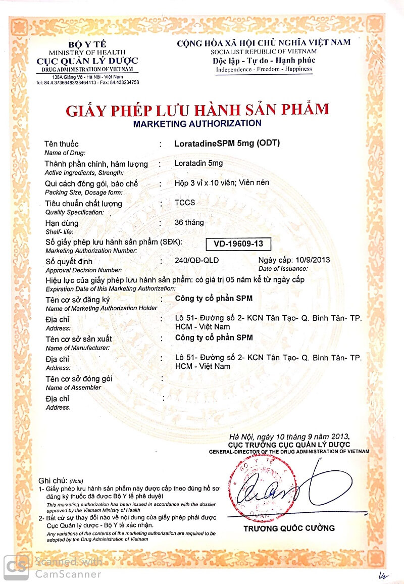 Loratadine SPM 5mg (ODT) Điều trị viêm mũi dị ứng, viêm kết mạc dị ứng, ngứa, mề đay... được Cơ quan quản lý nhà nước cấp giấy xác nhận công bố lưu hành trên toàn quốc, Số: VD-19609-13