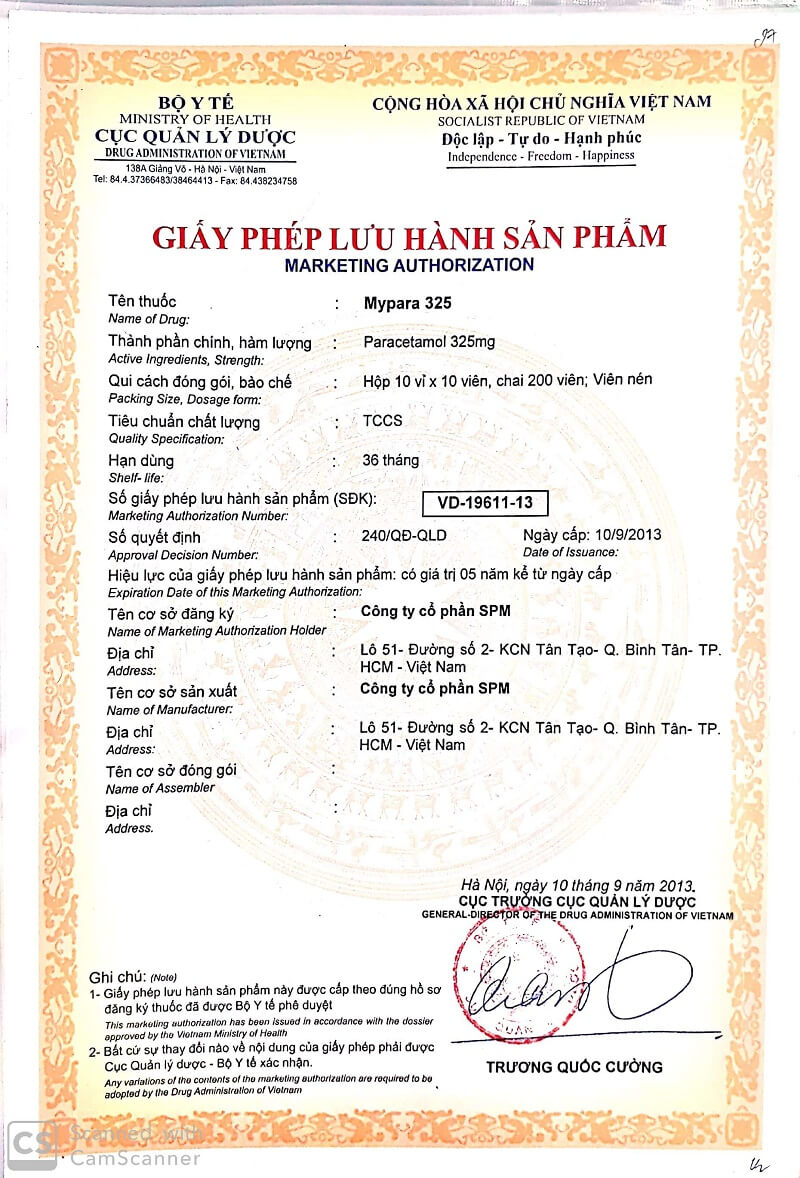 MyPara 325 Điều trị các chứng đau từ mức nhẹ đến vừa được Cơ quan quản lý nhà nước cấp giấy xác nhận công bố lưu hành trên toàn quốc, Số: VD-19611-13