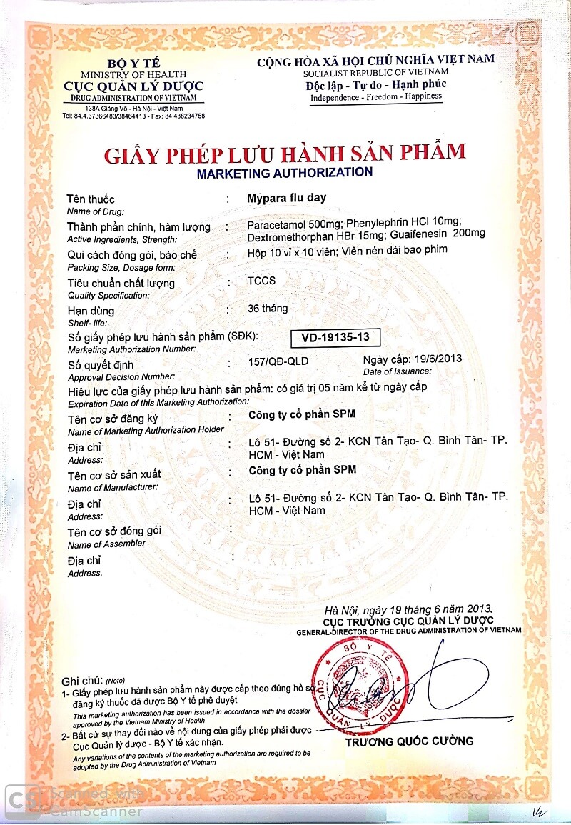 Mypara Flu Day Điều trị các triệu chứng ho, sốt, các cơn đau nhẹ, đau họng, nhức đầu, sung huyết mũi,... được Cơ quan quản lý nhà nước cấp giấy xác nhận công bố lưu hành trên toàn quốc, Số: VD-19135-13