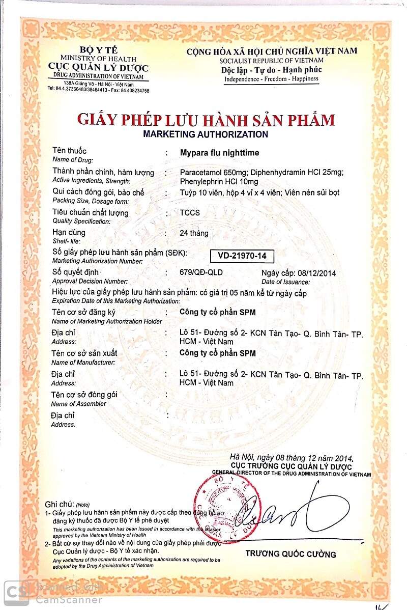 Mypara Flu Nighttime Làm giảm tạm thời sung huyết mũi, chảy mũi (sổ mũi), hắt hơi, ngứa và chảy nước mắt, đau họng, nhức đầu, đau mình và sốt do cảm lạnh, hay các chứng dị ứng của đường hô hấp trên,... được Cơ quan quản lý nhà nước cấp giấy xác nhận công bố lưu hành trên toàn quốc, Số: VD-21970-14