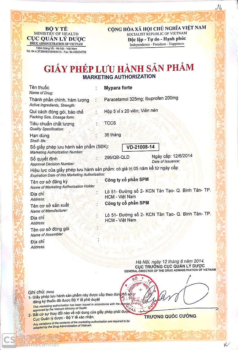 MyPara Forte Giảm đau, kháng viêm trong các trường hợp đau cơ khớp.Điều trị cảm sốt, nhức đầu, đau răng,... được Cơ quan quản lý nhà nước cấp giấy xác nhận công bố lưu hành trên toàn quốc, Số: VD-21008-14