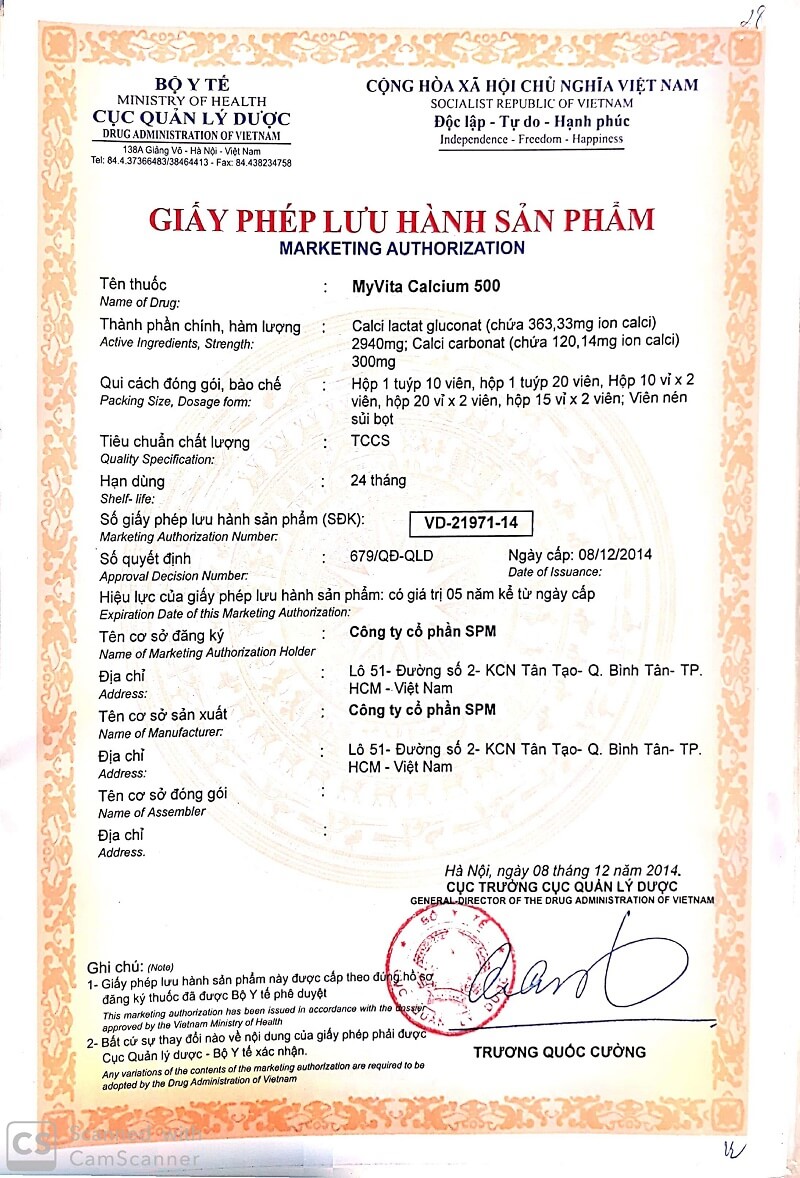MyVita Calcium 500 bổ sung Canxi và ngừa loãng xương, được Cơ quan quản lý nhà nước cấp giấy xác nhận công bố lưu hành trên toàn quốc, Số: VD-21971-14
