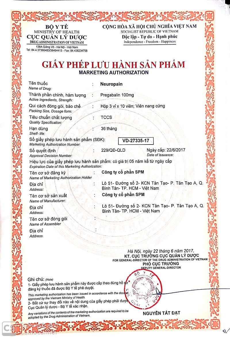 Neuropain Đau do nguyên nhân thần kinh, Động kinh, Đau cơ do xơ hóa, Rối loạn lo âu lan tỏa... được Cơ quan quản lý nhà nước cấp giấy xác nhận công bố lưu hành trên toàn quốc, Số:VD-27335-17