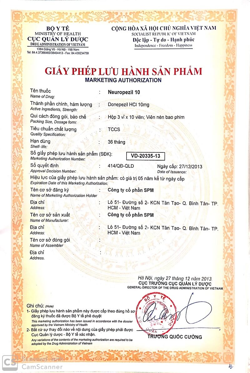 Neuropezil 10Điều trị triệu chứng gỉam trí nhớ ở mức độ nhẹ hoặc vừa trong bệnh Alzheimer... được Cơ quan quản lý nhà nước cấp giấy xác nhận công bố lưu hành trên toàn quốc, Số: VD-20335-13