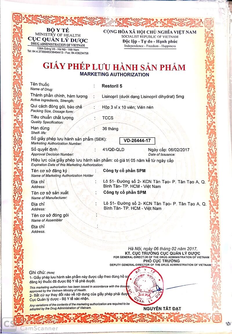 Restoril 5 Điều trị tăng huyết áp, Suy tim ứ huyết, Nhồi máu cơ tim cấp, Biến chứng trên thận ở bệnh nhân đái tháo đường... được Cơ quan quản lý nhà nước cấp giấy xác nhận công bố lưu hành trên toàn quốc, Số:VD-26444-17