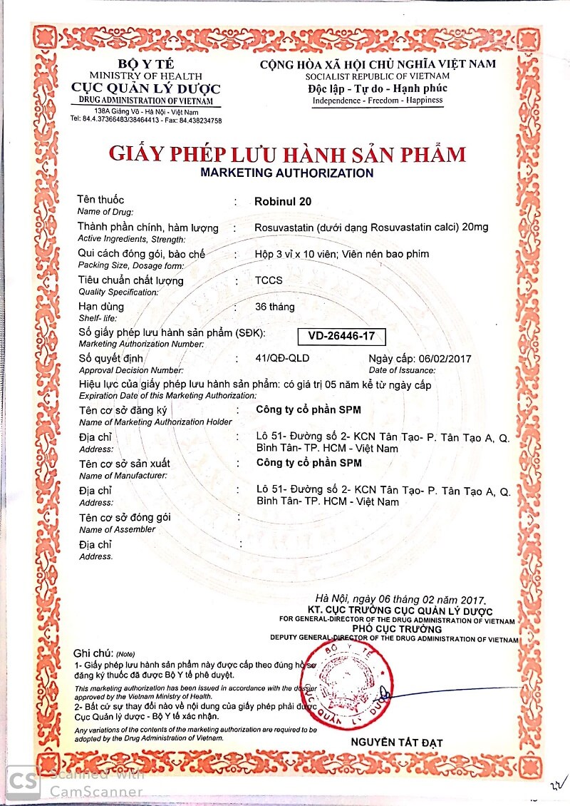 Robinul 20 Điều trị tăng Cholesterol máu. Ngăn ngừa các vấn đề tim mạch... được Cơ quan quản lý nhà nước cấp giấy xác nhận công bố lưu hành trên toàn quốc, Số:VD-26446-17