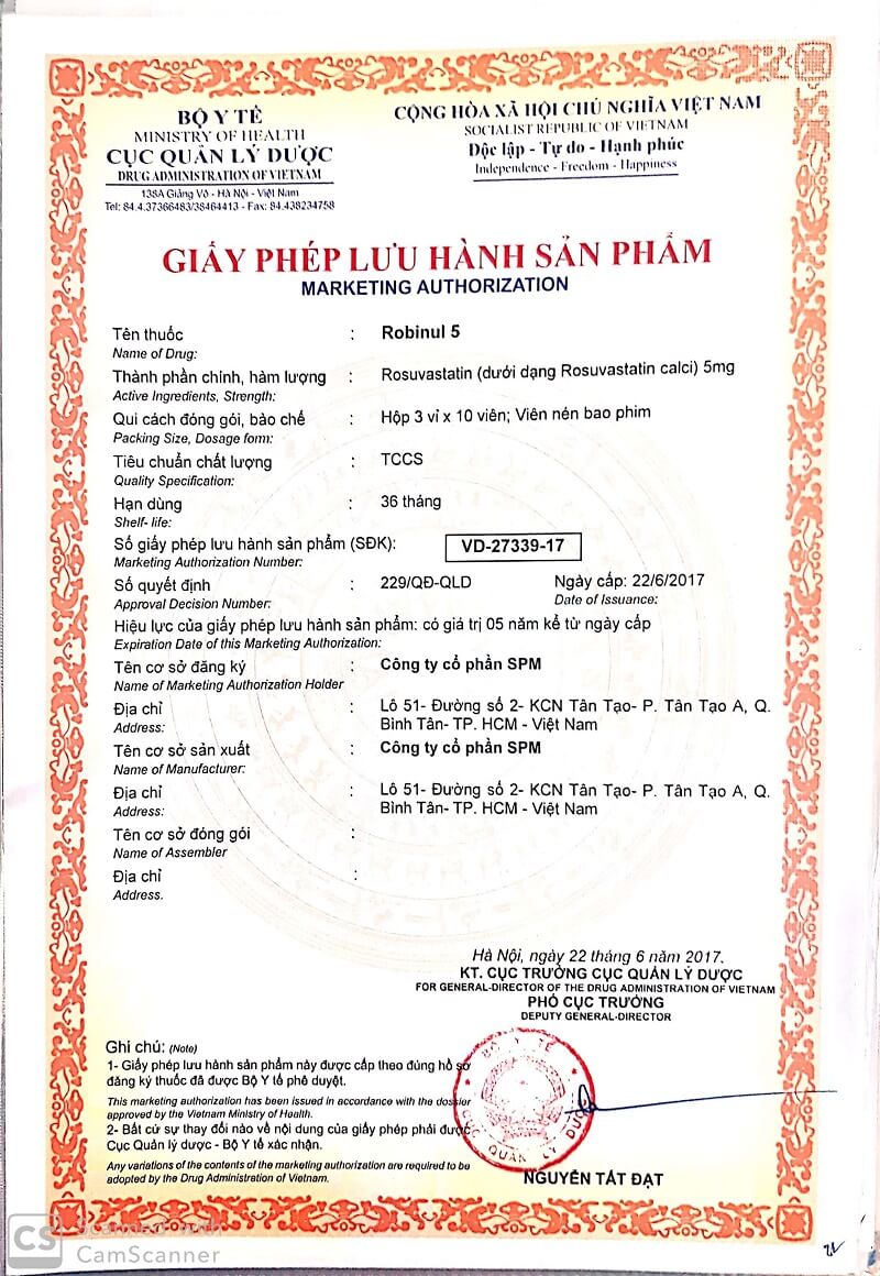 Robinul 5 Điều trị tăng Cholesterol máu. Ngăn ngừa các vấn đề tim mạch... được Cơ quan quản lý nhà nước cấp giấy xác nhận công bố lưu hành trên toàn quốc, Số:VD-27339-17