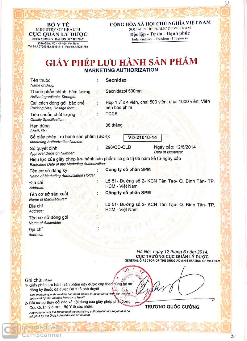 Secnidaz Điều trị Bệnh amip ở ruột và gan. Bệnh Giardia. Viêm âm đạo và niệu đạo do Trichomonas vaginalis.Sản phẩm được Cơ quan quản lý nhà nước cấp giấy xác nhận công bố lưu hành trên toàn quốc, Số: VD-21010-14