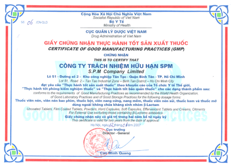 SPM tự hào là doanh nghiệp có nhà máy sản xuất đạt chứng nhận GMP (Good Manufacturing Practices – Thực hành sản xuất thuốc tốt), GLP (Good Labolatory Practices – Thực hành kiểm nghiệm thuốc tốt), GSP (Good Storage Practices – Thực hành bảo quản thuốc tốt) theo tiêu chuẩn ASEAN cho dây chuyền sản xuất thuốc viên, viên nang, thuốc nhỏ mắt và thuốc dùng ngoài da. Hệ thống quản lý chất lượng đạt tiêu chuẩn ISO 9001:2000 do Tổ chức Chứng nhận Chất lượng Quốc tế UKAS (Anh) chứng nhận. Đạt chứng nhận GMP theo tiêu chuẩn của tổ chức Y tế Thế giới (GMP- WHO).