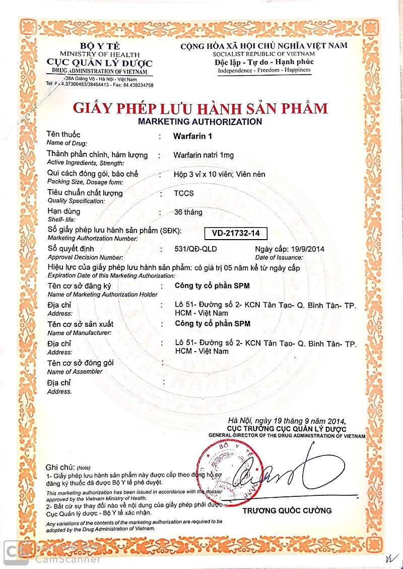 Warfarin 1 Chỉ định để dự phòng nghẽn mạch toàn thân ở những bệnh nhân bị bệnh thấp tim và rung nhĩ, Chỉ định để dự phòng dai khi thay van tim nhân tạo, Chỉ định để dự phòng và điều trị huyết khối tĩnh mạch và thuyên tắc phổi, Chỉ định cho cơn thiếu máu cục bộ thoáng qua... được Cơ quan quản lý nhà nước cấp giấy xác nhận công bố lưu hành trên toàn quốc, Số:VD-21732-14