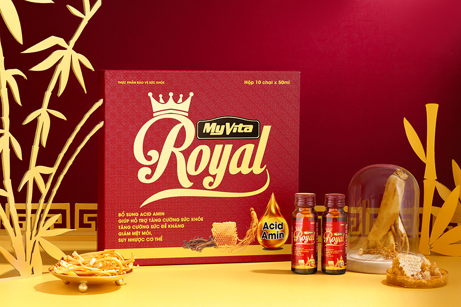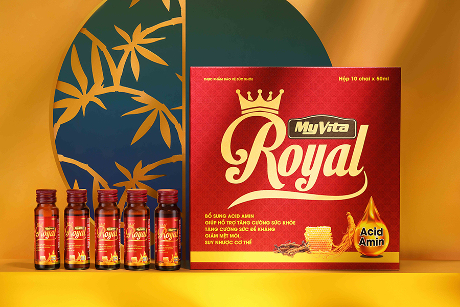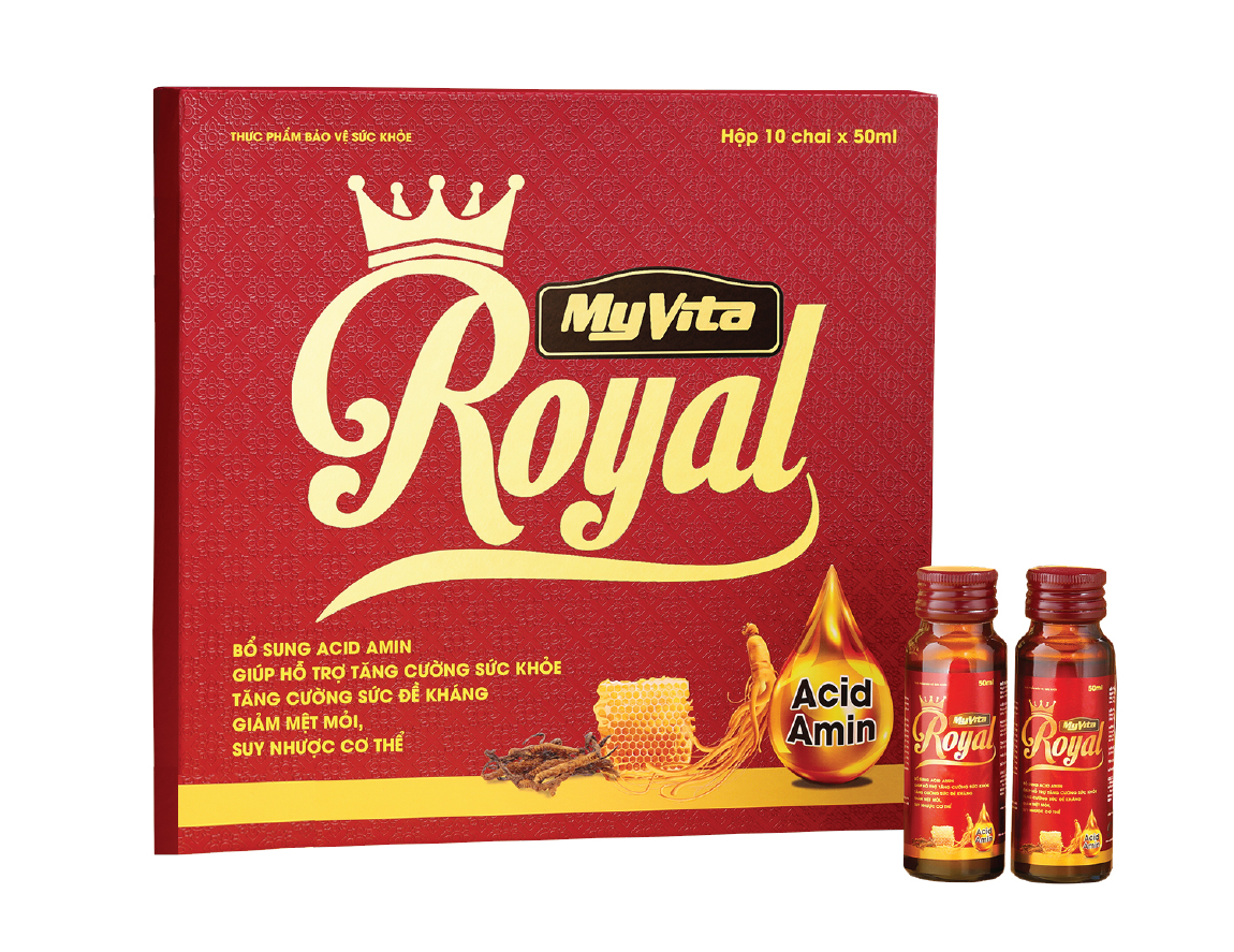 Điểm đặc biệt của MyVita Royal là sự kết hợp của thành phần dược liệu từ thiên nhiên, bao gồm: 8 loại acid amin thiết yếu mà cơ thể không thể tự tổng hợp được, đông trùng hạ thảo, cao nhân sâm, cao sâm cau, sữa ong chúa. Sản phẩm đảm bảo an toàn, lành tính, rất phù hợp với người mới ốm dậy, người cao tuổi, người cần tăng cường sức khỏe, người sức đề kháng kém, đang gặp tình trạng mệt mỏi kéo dài.